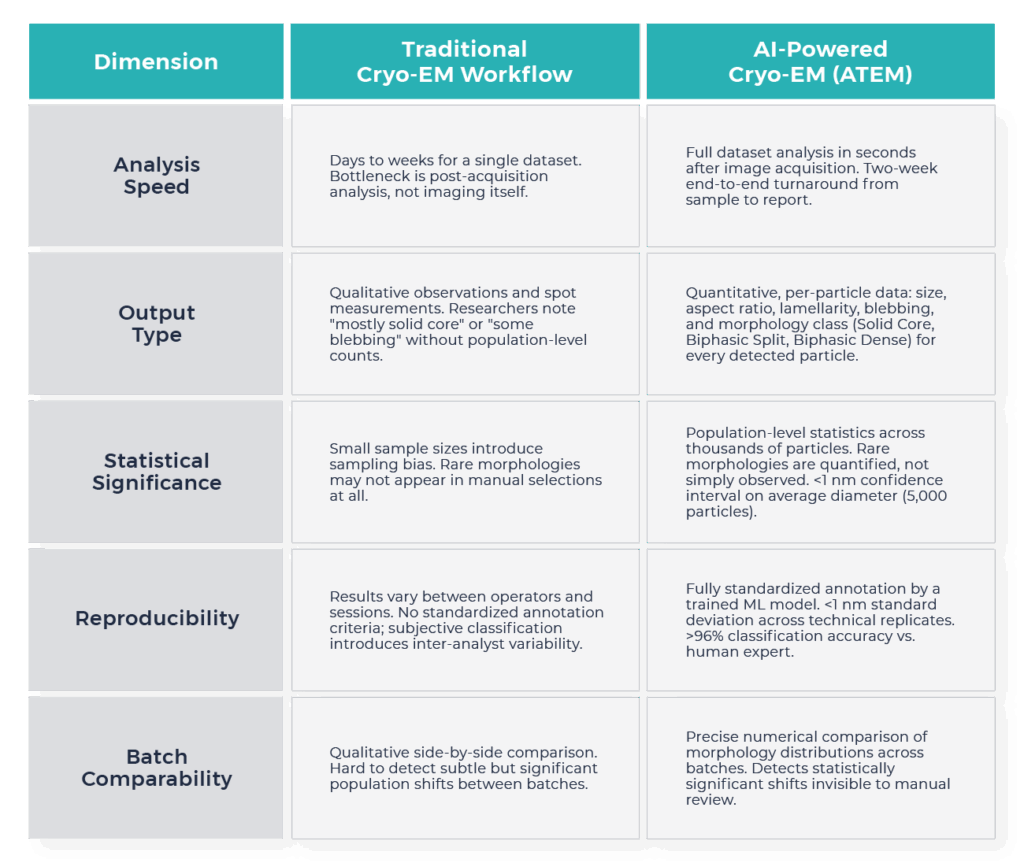 Obtaining quantitative LNP data requires a technique that can directly visualize individual nanoparticles. Cryo-electron microscopy (cryo-EM) provides exactly that capability, imaging LNPs in a vitrified, near-native state that preserves their true structure [6]. While the imaging itself is well established, analyzing the micrographs remains a major bottleneck in traditional workflows: researchers manually inspect the micrographs and measure particle properties (such as size and morphology) one particle at a time [7]. Because this process is slow, manual or even semi-automatic picking of 100,000 particle images would require several man-months [8]. Hence, the limitation of traditional workflows is therefore not the imaging itself, but the manual analysis that follows. AI-powered platforms remove this bottleneck by automating particle annotation across entire datasets. Vitrification and imaging remain unchanged; the transformation lies in annotation: ATEM’s cryo-EM platform segments every detectable LNP across a full dataset, classifying each into Solid Core, Biphasic Split or Biphasic Dense, while simultaneously extracting per-particle size, aspect ratio, lamellarity and blebbing. This way, thousands of nanoparticles are annotated in seconds rather than months.
